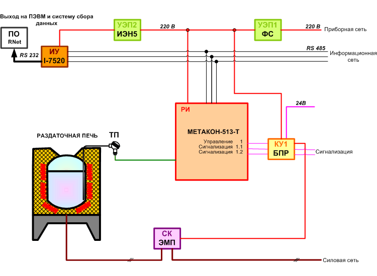 Применяется одноканальное регулирование, поэтому равномерность температур обеспечивается соответствующим распределением спиралей электронагревателей относительно реторты печи. Предъявлены высокие требования по точности поддержания температуры. Электронагрев, коммутация нагрузки силовым электромагнитным пускателем, сигнализация отклонений температуры по 2 уровням, сбор данных на ПЭВМ.